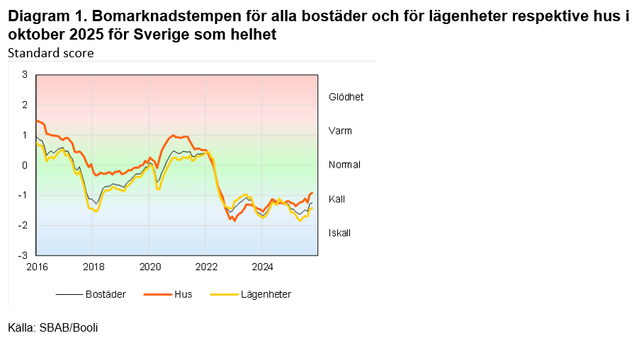 SBAB/Booli:s indikator Bomarknadstempen – som mäter hur lätt det är att sälja en bostad – visar att temperaturen på den svenska bostadsmarknaden som helhet fortsatte att stiga i oktober. För lägenheter sjönk både andelen prissänkta objekt och utbudet samtidigt som budpremierna och antalet budgivare steg – allt i förhållandet till sina historiska genomsnitt. Samma utveckling syntes för villor, med undantag för antalet budgivare som sjönk. I Stockholms innerstad är det normal temperatur och i Göteborgs dito nära normal temperatur. Innerstaden i Malmö är på tydlig uppgång. De mindre lägenheterna – ettor och tvåor – har nu nästan hämtat igen tappet till de större.