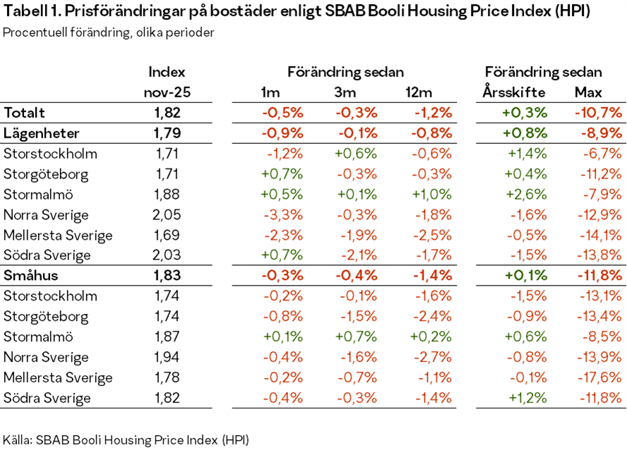 Bostadspriserna sjönk med 0,5 procent i november i Sverige som helhet