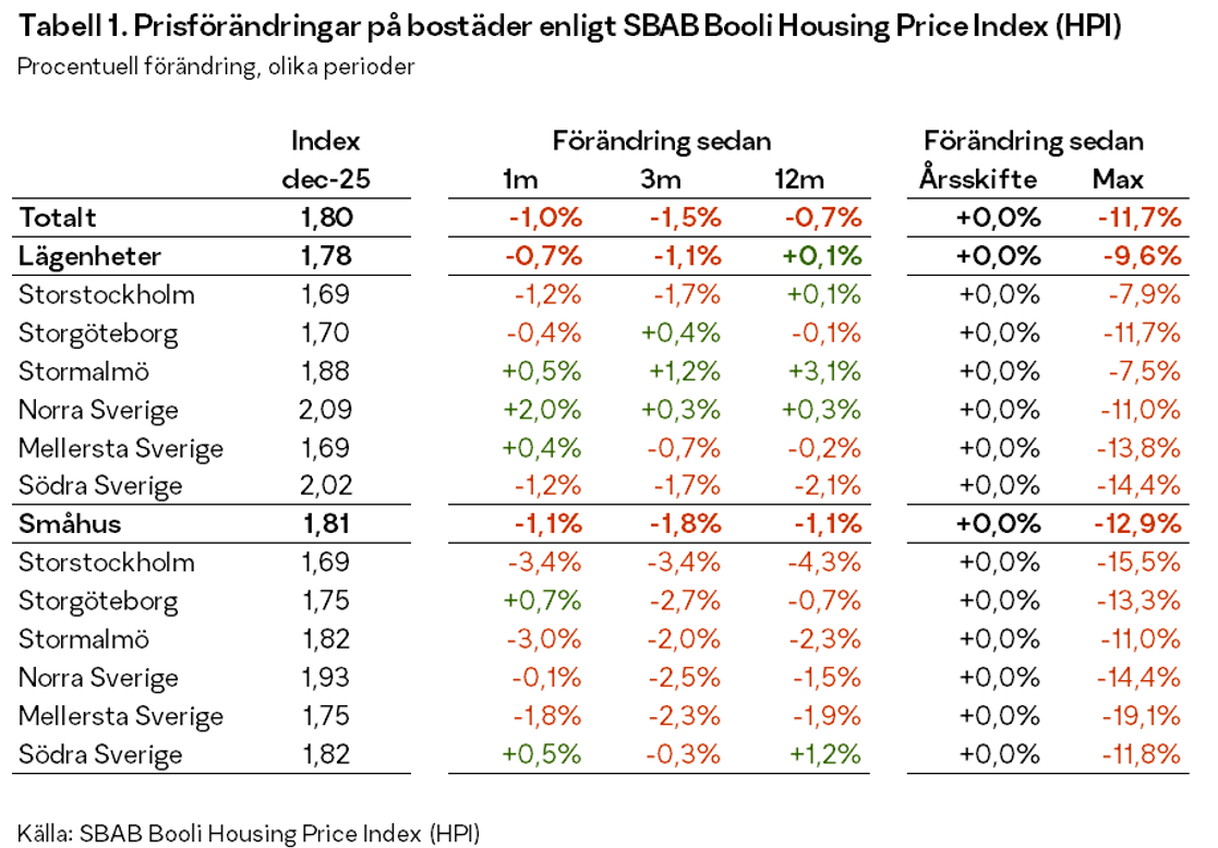 Bostadspriserna sjönk med i genomsnitt 1 procent i december i Sverige som helhet. Lägenhetspriserna sjönk med 0,7 procent och villapriserna med 1,1 procent. När hela 2025 summeras innebär detta att bostadspriserna under året föll med 0,7 procent. Med detta ligger bostadspriserna kvar på ungefär samma nivå som vid årsskiftet 2020/2021. Lägenhetspriserna ligger knappt 10 procent under toppnoteringarna från våren 2022 och villapriserna knappt 13 procent under. Trenden, där både normala säsongseffekter och andra tillfälliga effekter rensats bort, pekar dock mot stigande priser på både lägenheter och villor i december i Sverige som helhet. Samtidigt ser den tidigare uppåtgående trenden ut att ha mattats av. Detta visar SBAB Booli Housing Price Index (HPI).