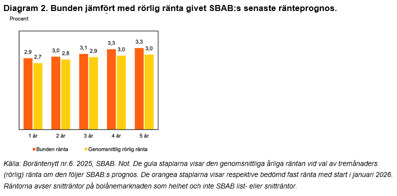 I SBAB:s senaste ränteprognos i rapporten Boräntenytt jämfördes den genomsnittliga 3-månadersräntan, om den binds om var tredje månad i linje med prognosen med räntor med räntebindningstider från ett år upp till fem år (diagram 2). Givet prognosen skiljde det rätt lite, cirka 0,2 procentenheter, mellan att binda räntan på ett till tre år och rörlig ränta. För fyra och fem års bindningstid skiljde det 0,3 procentenheter.