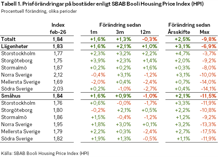Bostadspriserna steg med 1,6 procent i februari i Sverige som helhet