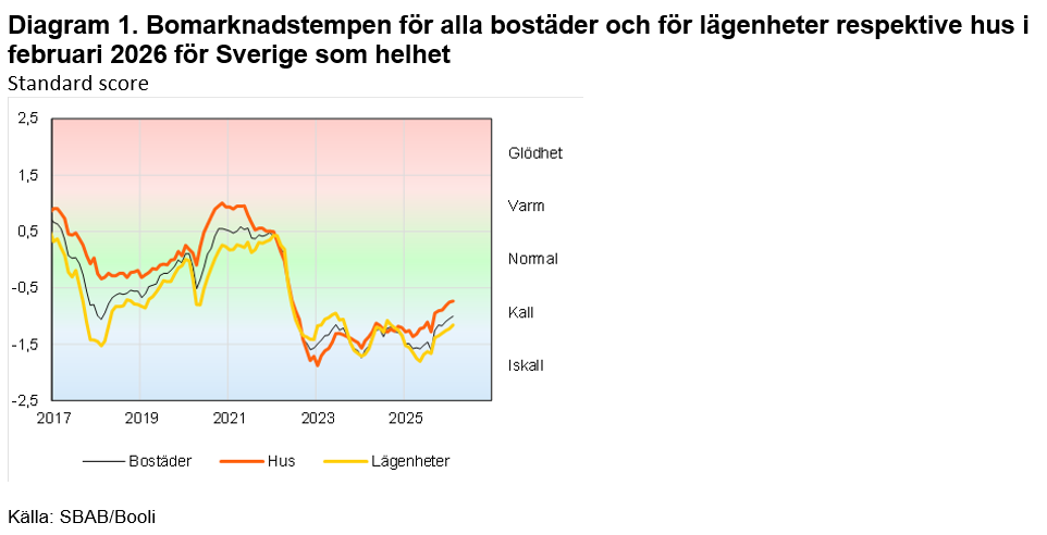 SBAB/Booli:s indikator Bomarknadstempen som mäter hur lätt det är att sälja en bostad visar att temperaturen på den svenska bostadsmarknaden som helhet fortsatte att stiga trendmässigt i februari. Ett krympande utbud och färre prissänkta bostäder var två faktorer som bidrog till detta för både lägenheter och hus. En långvarig konflikt i Mellanöstern kan dock bryta den uppåtgående trenden.