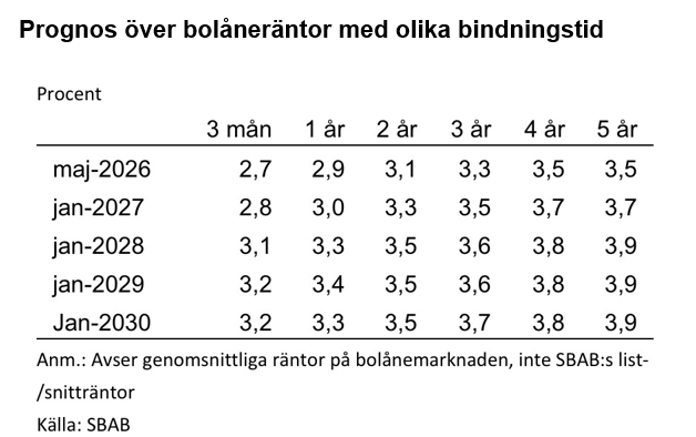 BNP-tillväxten i år revideras ned från 2,8 till 2,4 procent till följd av konflikten i Mellanöstern. Av samma skäl bedöms inflations- och ränteriskerna nu ligga mer på uppåt- än nedåtsidan jämfört med föregående prognos. Huvudscenariot är dock fortfarande oförändrad styrränta fram till mars nästa år. Bostadspriserna väntas stiga med drygt 4 procent och bostadsbyggandet öka svagt. Även om styrräntan blir oförändrad kan bolåneräntorna komma att variera beroende på ändrade marknadsräntor och därmed upplåningskostnader för bankerna.